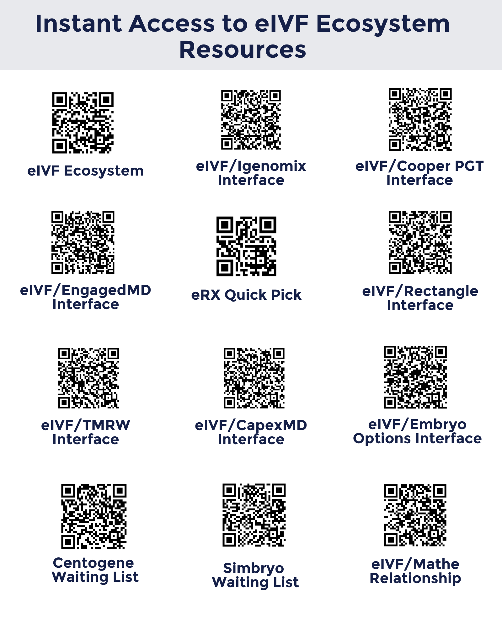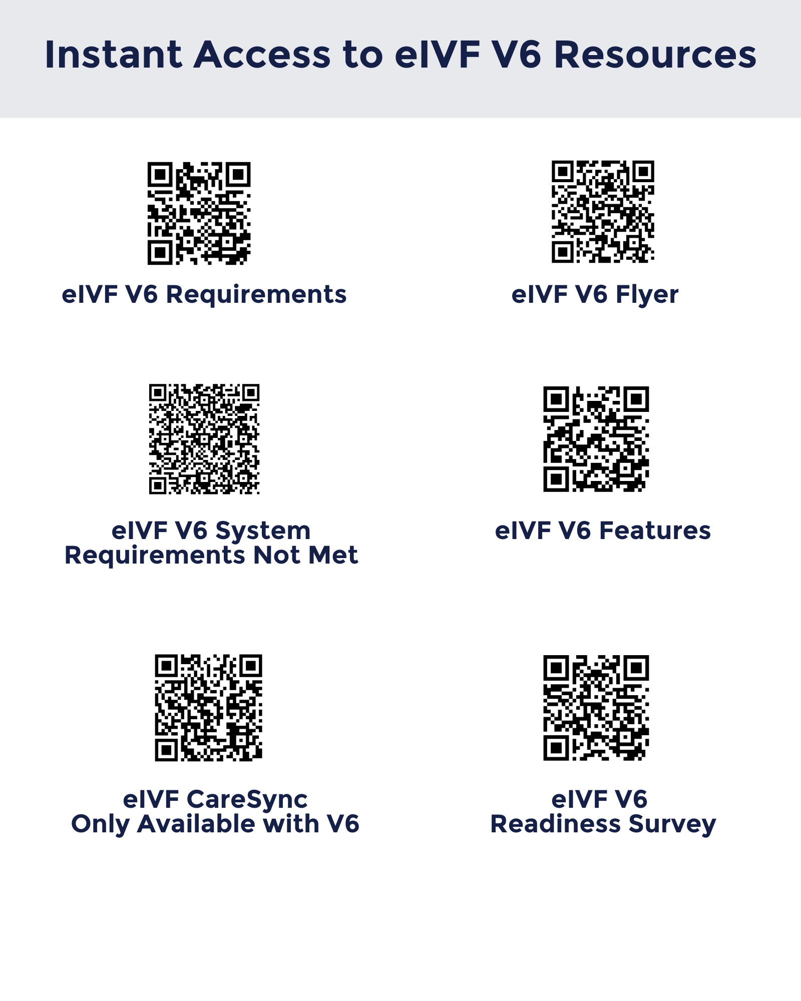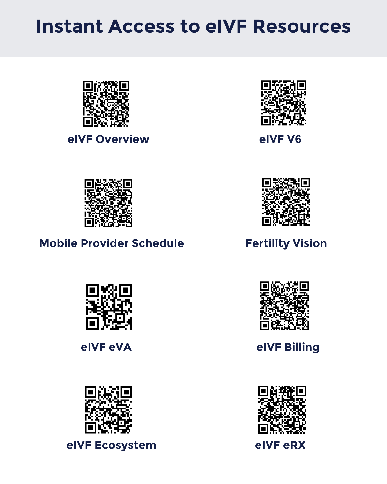 Get instant access to key resources and discover how our solutions—eIVF Partners, V6, Fertility Vision, and more—are transforming fertility care. Scan the QR codes below to explore the innovation driving clinic success!